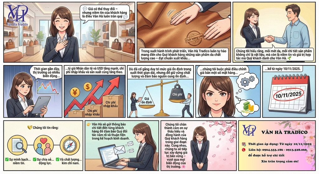 📅 Vân Hà Tradico xin thông báo lại: Từ ngày 10/11/2025, công ty sẽ điều chỉnh tăng giá một số mặt hàng do biến động tỷ giá và chi phí nhập khẩu nguyên liệu.